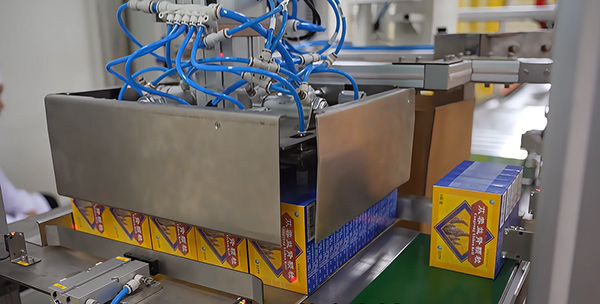 該工位將前端理料后的整齊產(chǎn)品一次性精準抓取并放置在開好的紙箱內(nèi),配置有撐箱機構(gòu),保證產(chǎn)品順利進入紙箱;同時,該工位可配置合格證、說明書等包裝附件的自動裝箱。